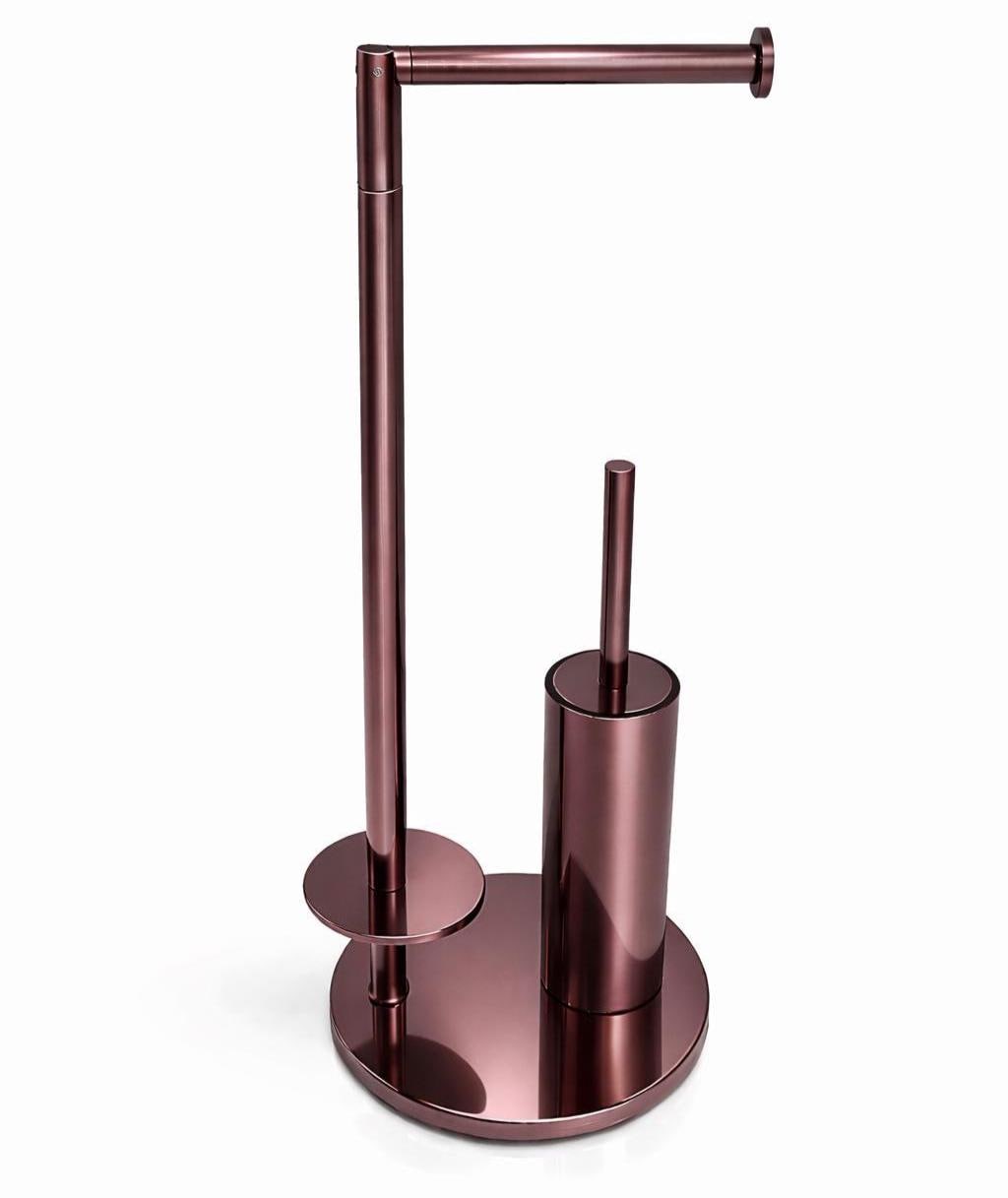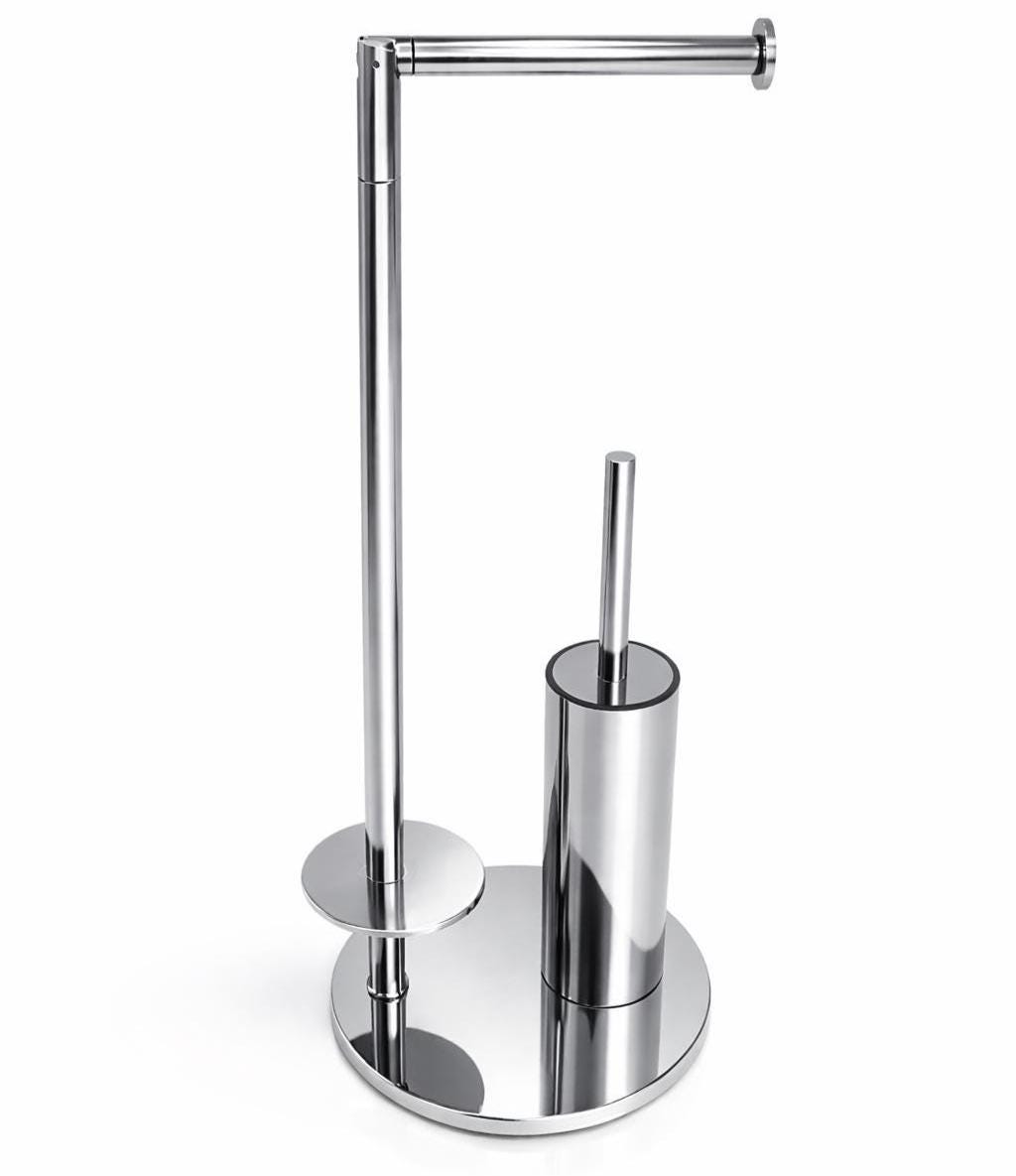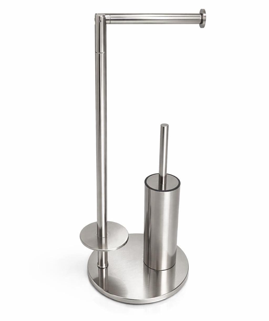 Free standing toilet paper holder with toilet brush made from stainless steel SUS304. Luxury bathroom organizer combining toilet roll holder and brush set with stable base and modern finishes.
