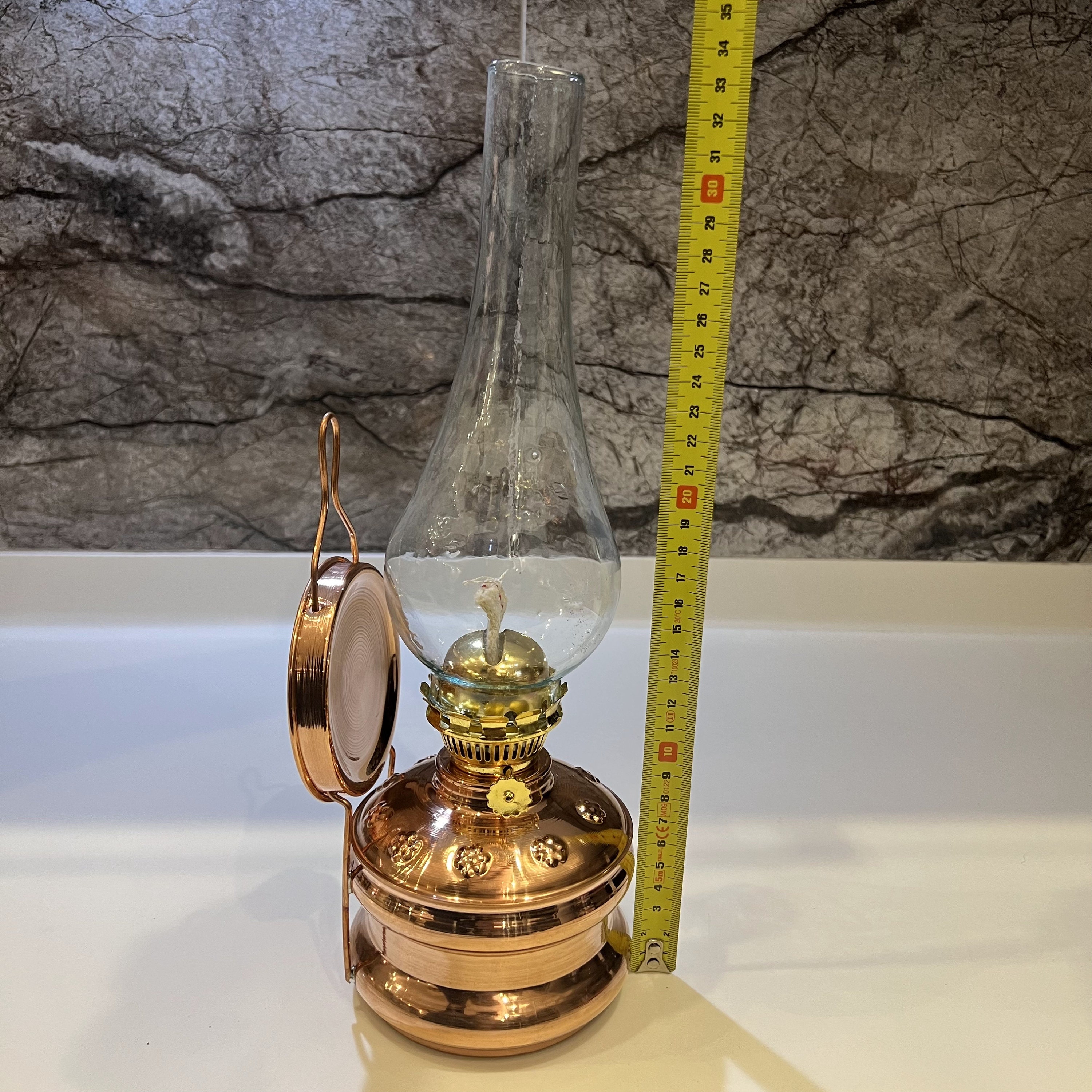 Elevate your living spaces with our exquisite Copper Gas Lamp, a masterpiece of craftsmanship and timeless elegance. Crafted with precision, this lamp boasts a beautifully curved, highly polished body adorned with intricate embossed motifs, a true testament to the artistry of copperwork. The protective glass top is made of authentic glass with a delicately serrated pattern along the upper edge, adding a touch of sophistication to its design.