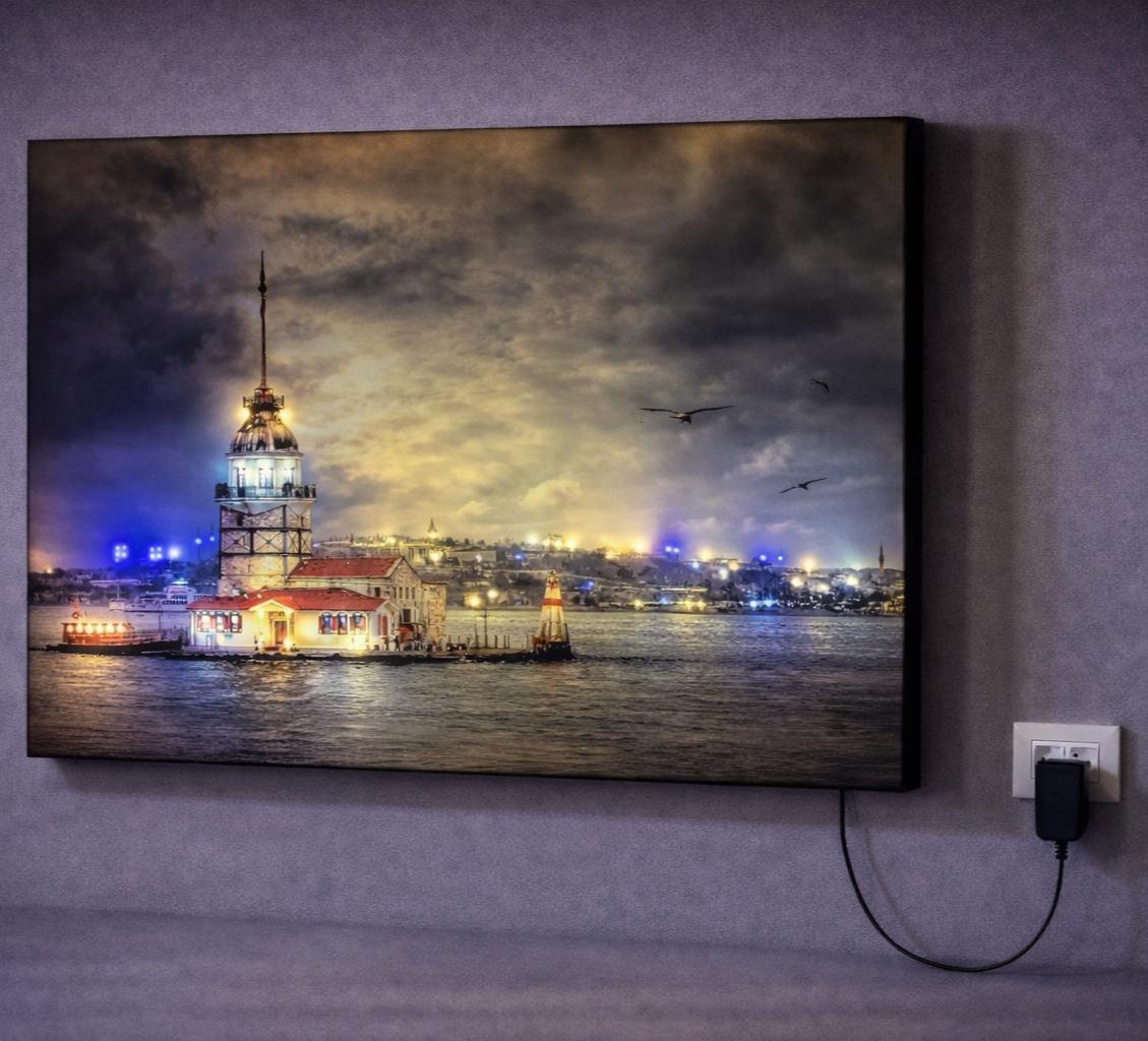 LED illuminated Istanbul Maiden’s Tower canvas wall art featuring a glowing night cityscape. Lighted landmark decor for living room, office or a unique Istanbul gift idea.