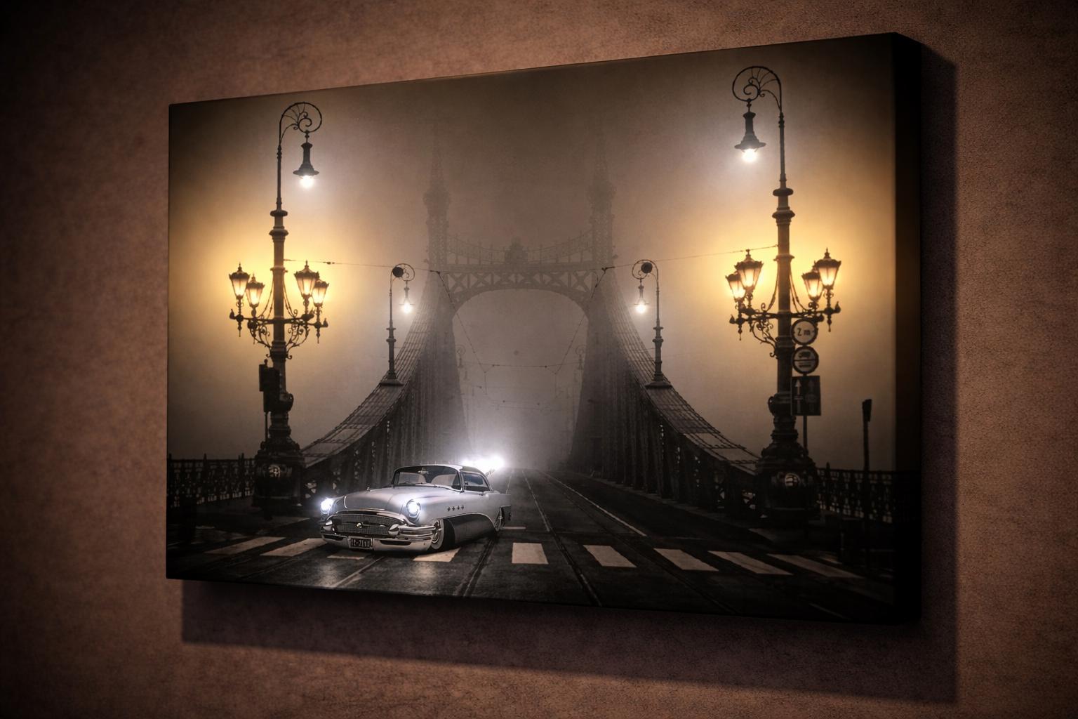 Keywords: budapest wall art, liberty bridge canvas, hungary wall decor, vintage car art, led canvas art, european city wall art, foggy night canvas