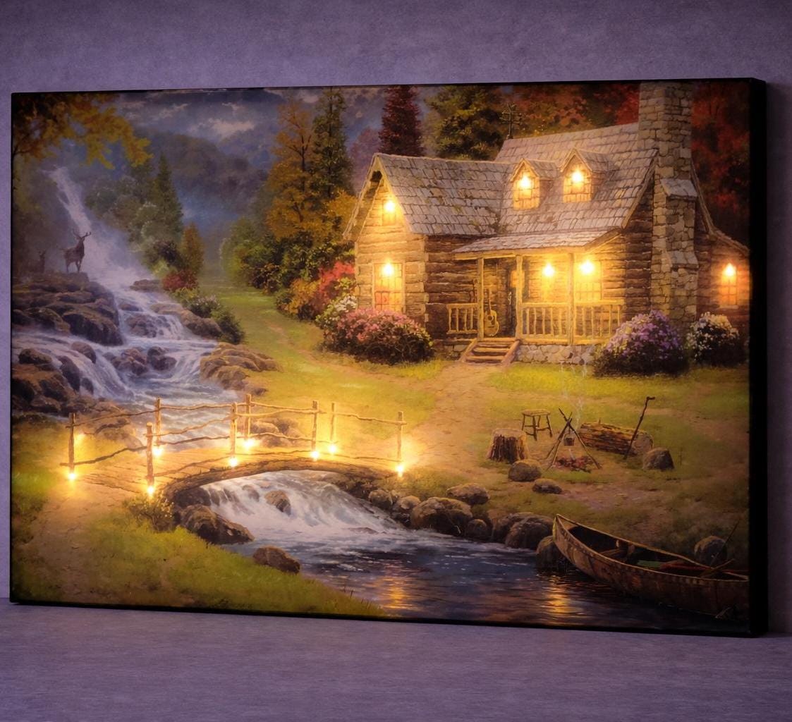 Keywords: LED cabin canvas art, illuminated nature wall art, riverside cabin decor, forest landscape canvas, rustic home wall art, wildlife cabin painting