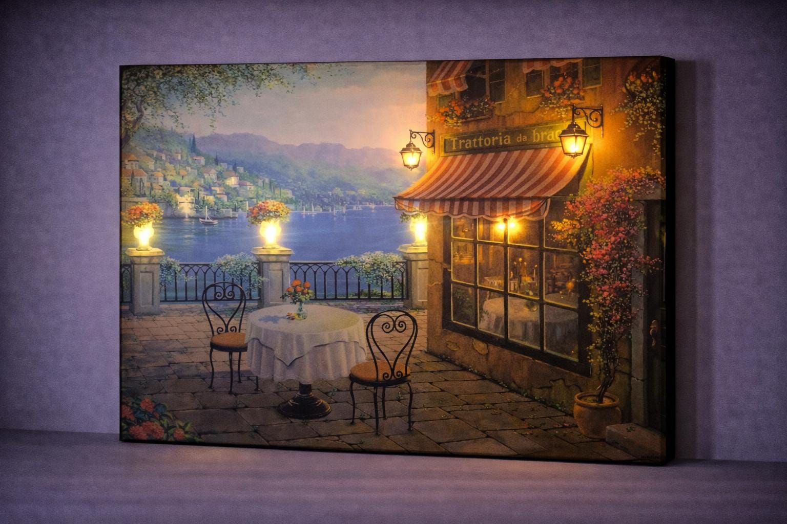Keywords: lakeside wall art, restaurant canvas art, terrace wall decor, romantic cafe decor, illuminated canvas art, cozy wall art, dining room wall decor