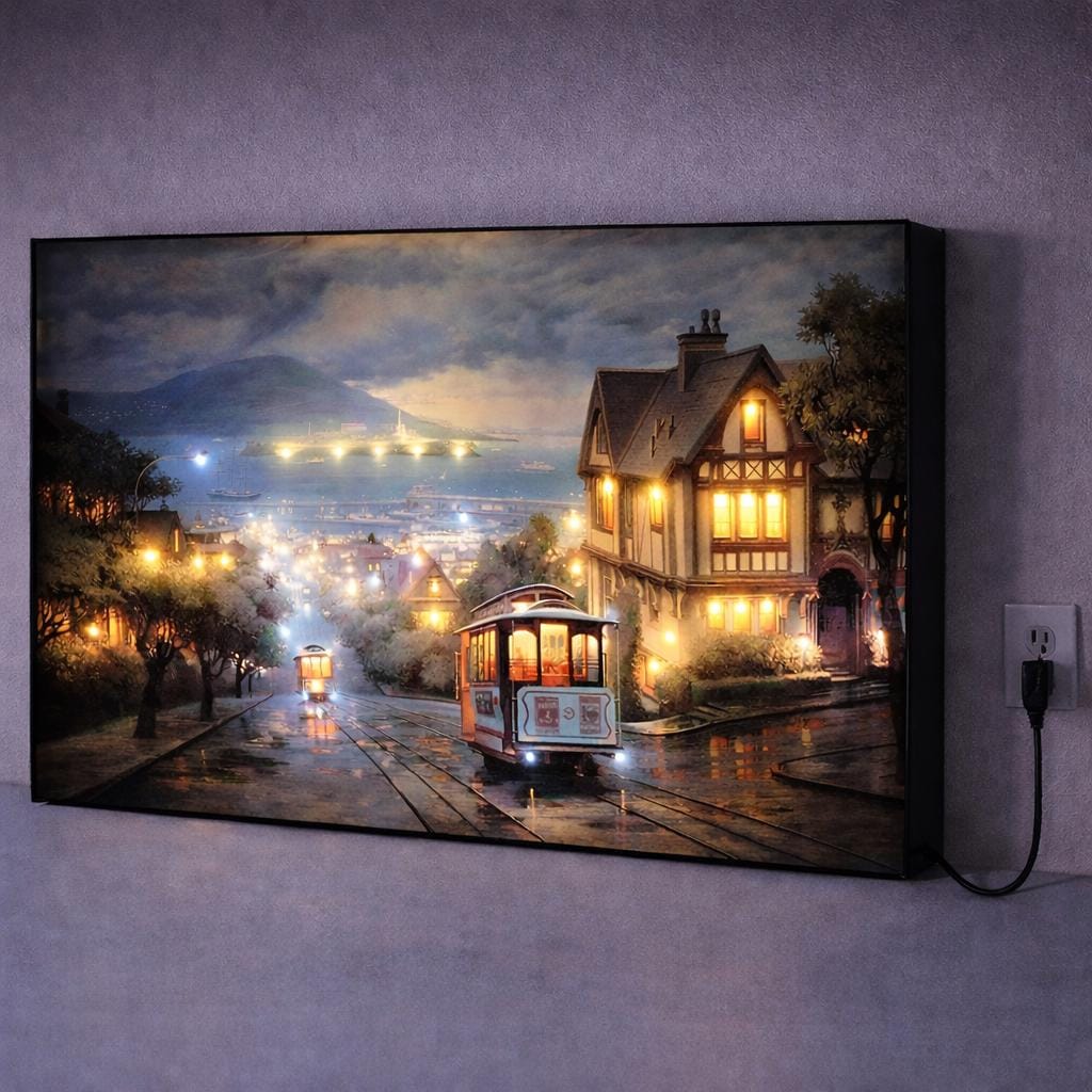 LED illuminated San Francisco rainy night canvas art featuring iconic urban street reflections and glowing city lights. Great for modern home, bedroom or office wall décor.
