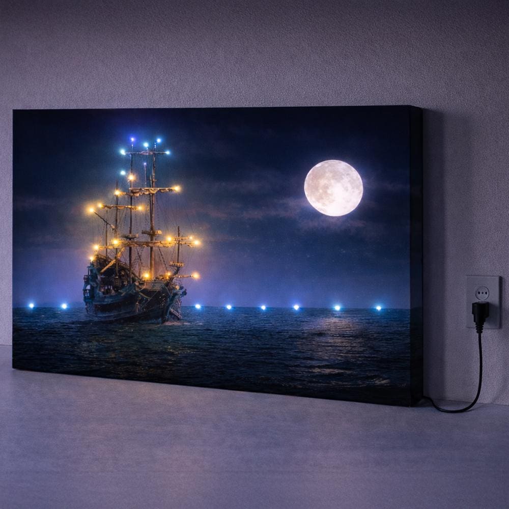 With a full moon lighting the calm ocean surface, this canvas merges peaceful nightscapes with subtle ambient LED illumination â perfect for creating a tranquil retreat in any room.