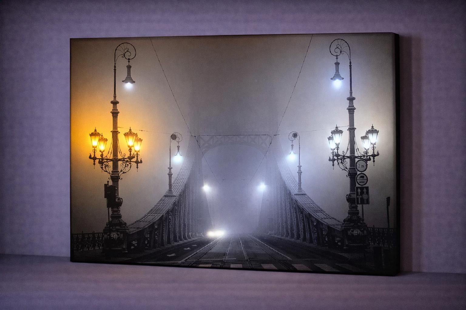 LED Budapest Liberty Bridge canvas wall art with foggy night atmosphere and glowing street lights. Battery powered cityscape decor for modern, moody and ambient interiors.