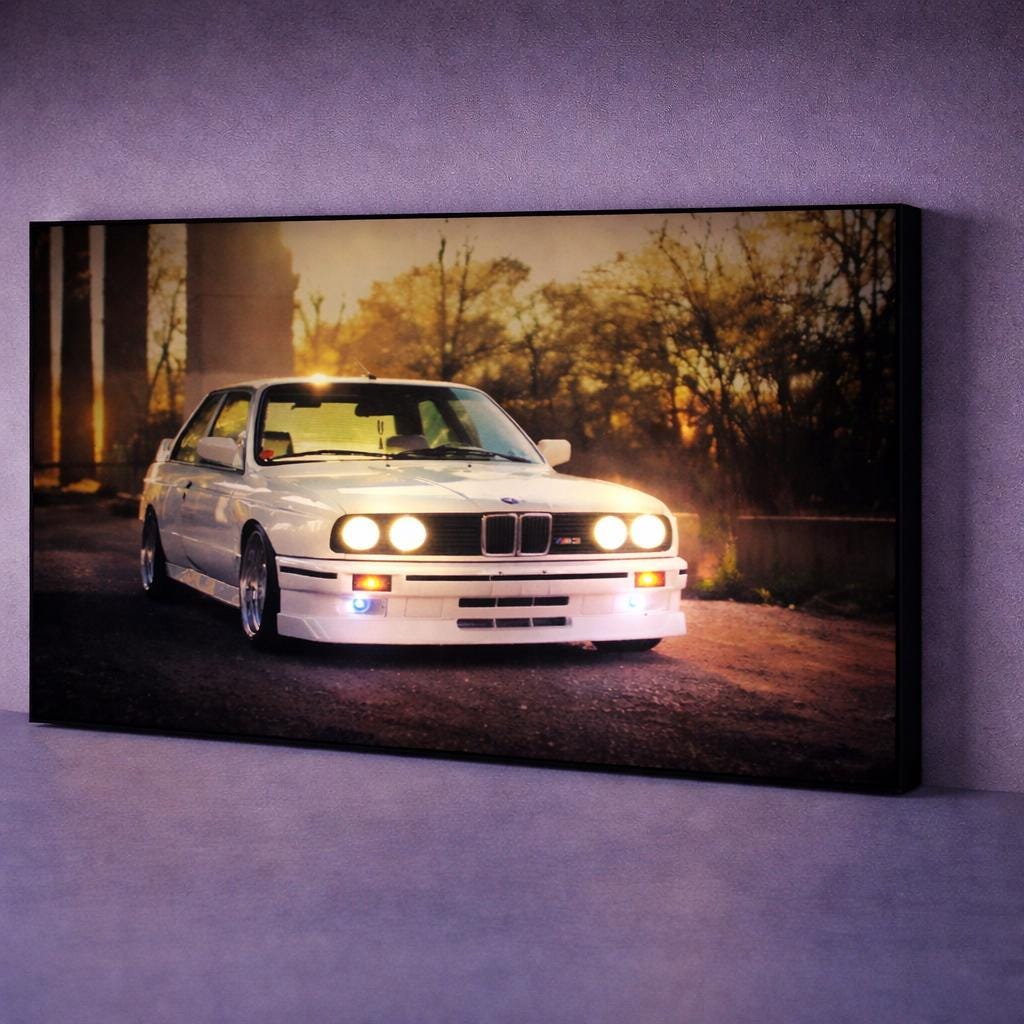 LED illuminated E30 M3 canvas wall art, retro BMW car artwork with integrated LED lights, classic car wall decor, automotive canvas art for garage, office or man cave.