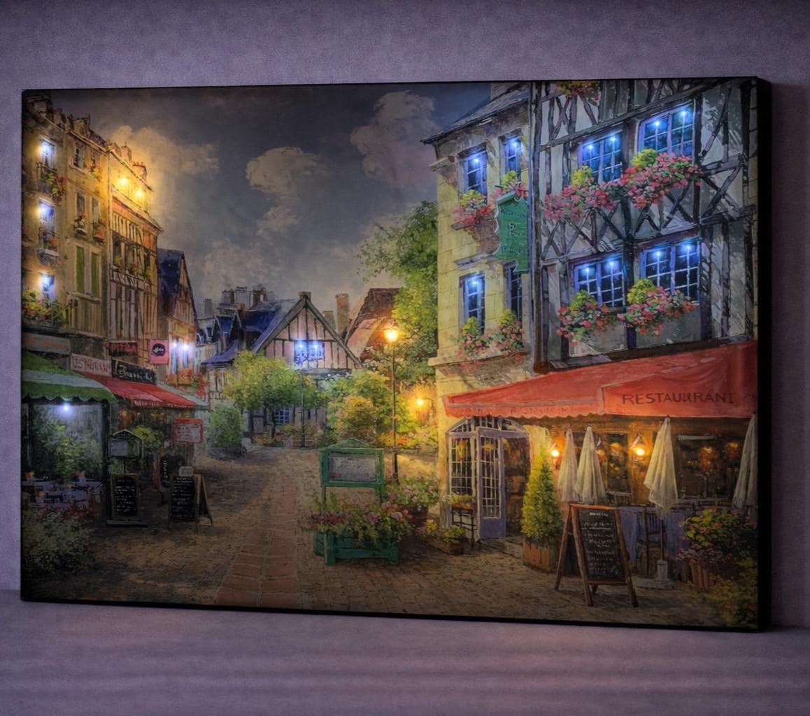 Keywords: LED canvas wall art, lighted canvas painting, European street canvas, illuminated wall decor, battery powered wall art, restaurant street art, cozy wall decor, lighted artwork gift, café decor canvas, ambient wall lighting art