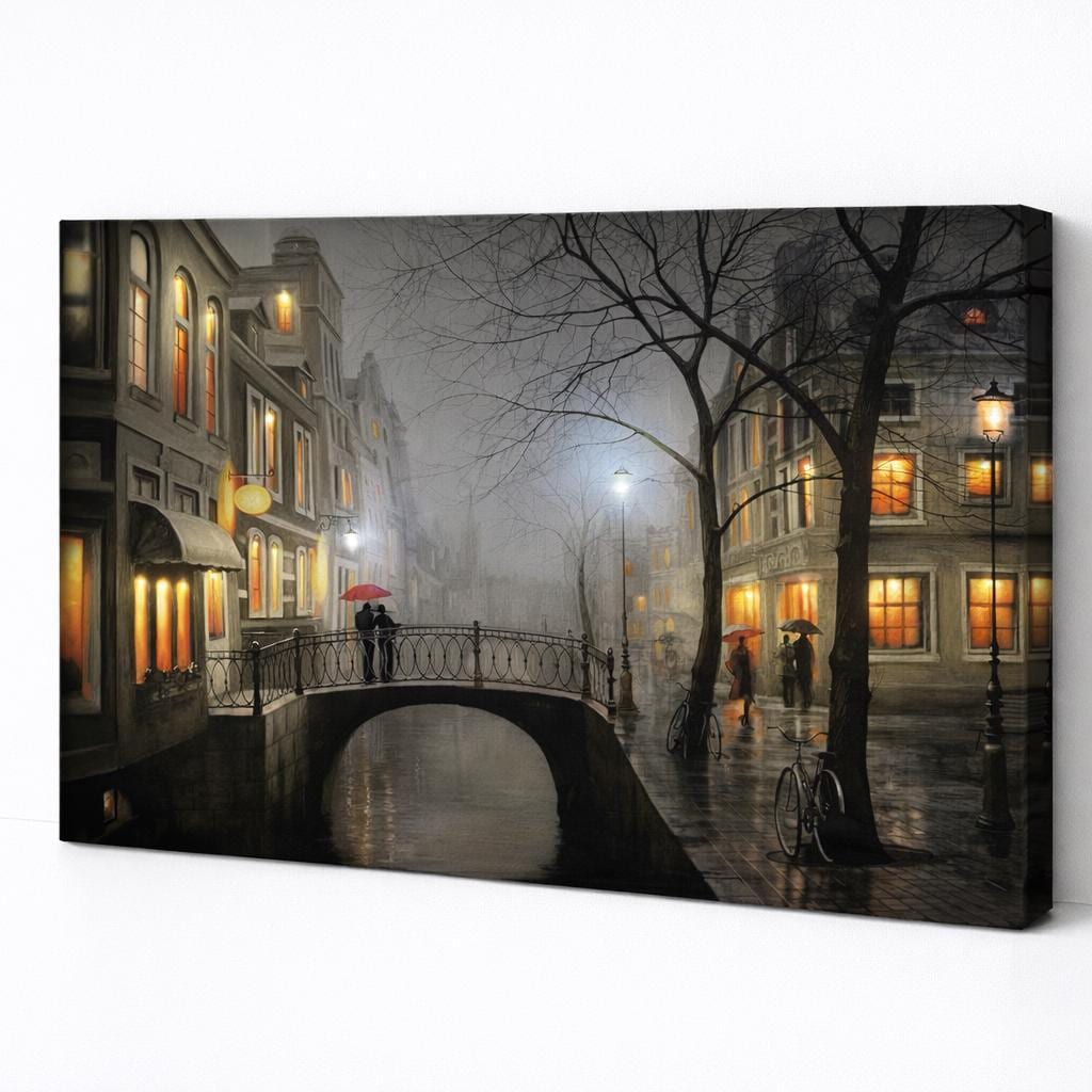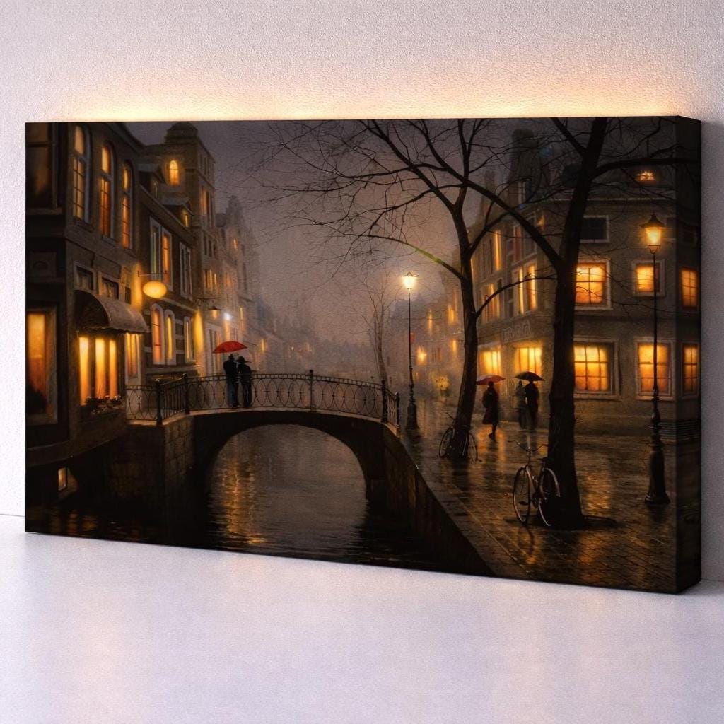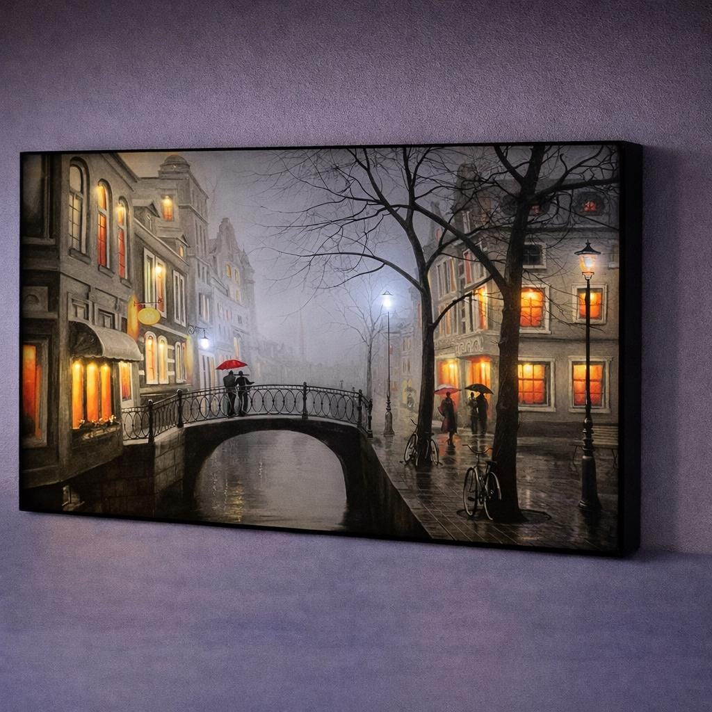 LED illuminated romantic city bridge canvas featuring a red umbrella couple in the rain. Creates a warm, cozy atmosphere. Perfect anniversary gift or bedroom wall decor.