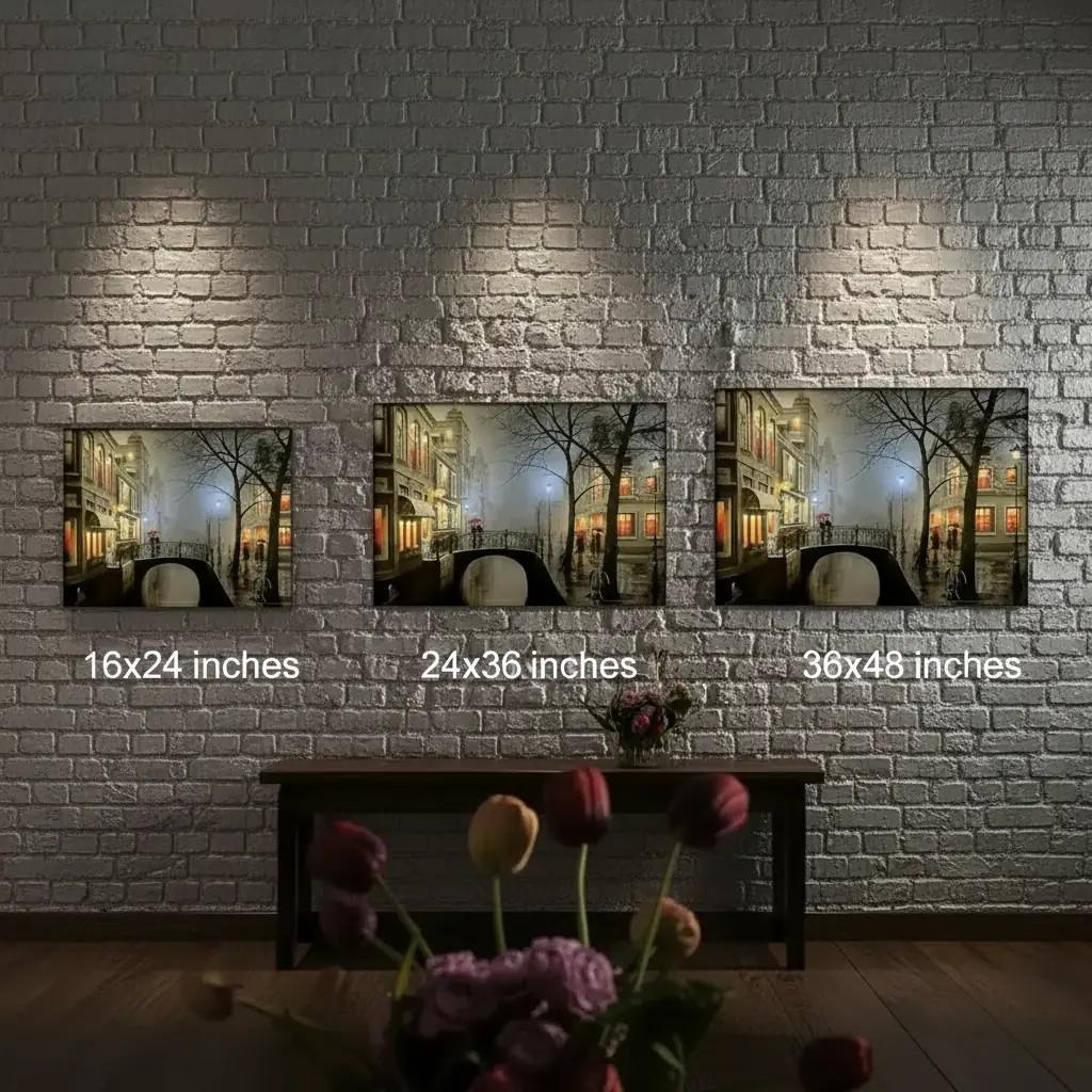 Soft glowing windows, elegant streetlamps, reflections on the rain-soaked street, and the iconic red umbrella couple create an unforgettable emotional impact. It is not just a wall art — it becomes the heart of your room.