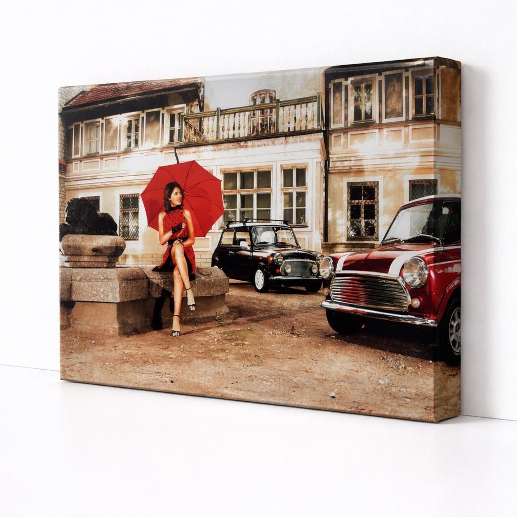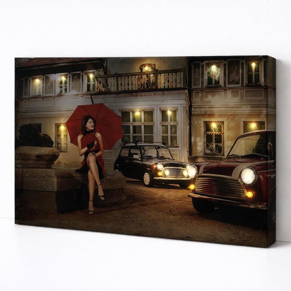 LED illuminated canvas wall art featuring a lady in red with classic Mini cars, vintage street decor, battery powered lighted canvas, unique gift for home, office, and art lovers.