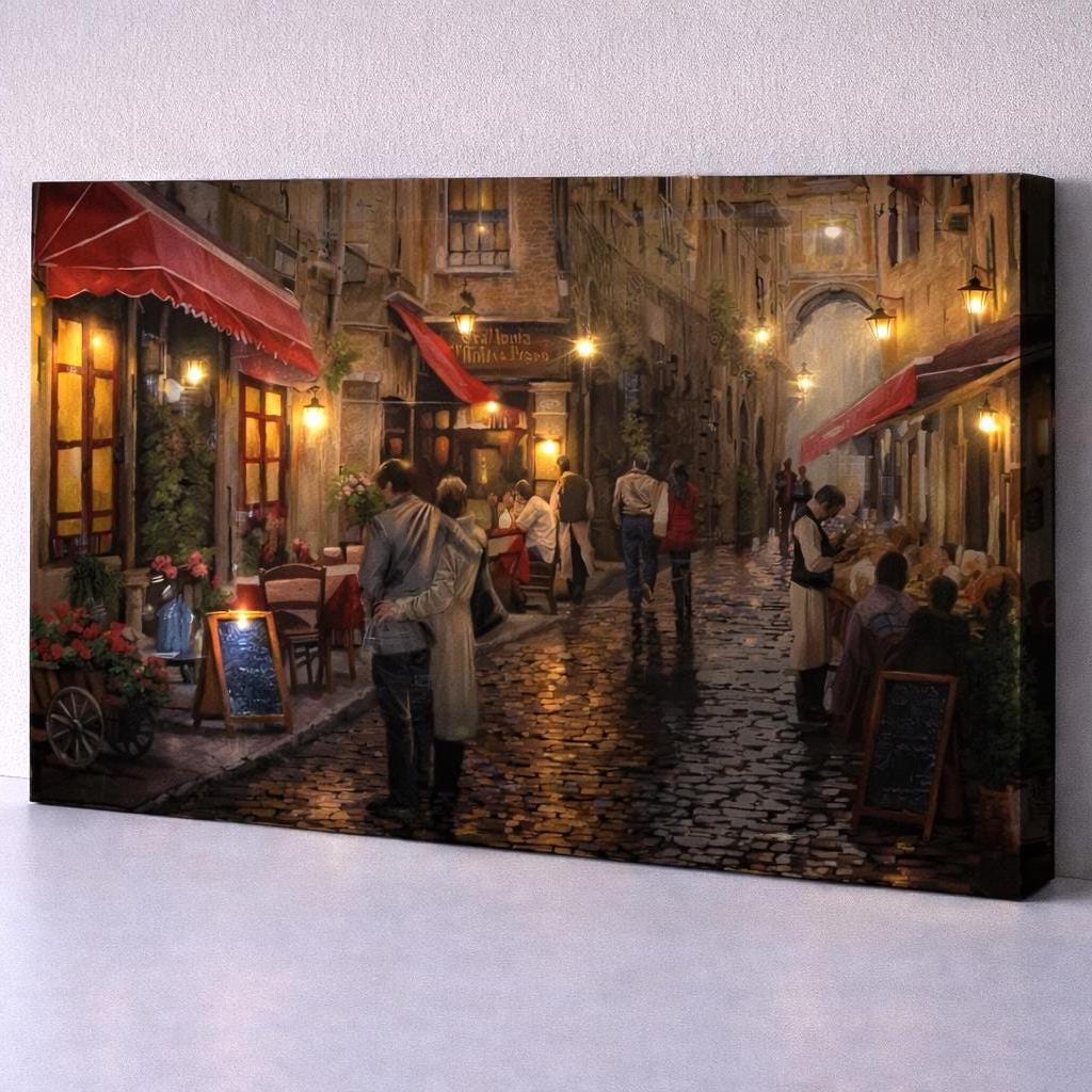 Relive the enchantment of an intimate evening with this captivating LED backlit canvas art. The artwork portrays a charming and stylish alleyway adorned with cafes and restaurants. In the heart of it, a loving couple embraces, gazing at the bustling world around them. Cafe and restaurant tables line the street's edges, where people dine and engage in lively conversations. When you switch on the canvas's lights, the warm glow of the houses, the gentle illumination of street lamps, and the inviting ambiance of cafes and restaurants come to life, inviting you to immerse yourself in the romantic allure of this enchanting scene. Here's why this piece is a must-have: