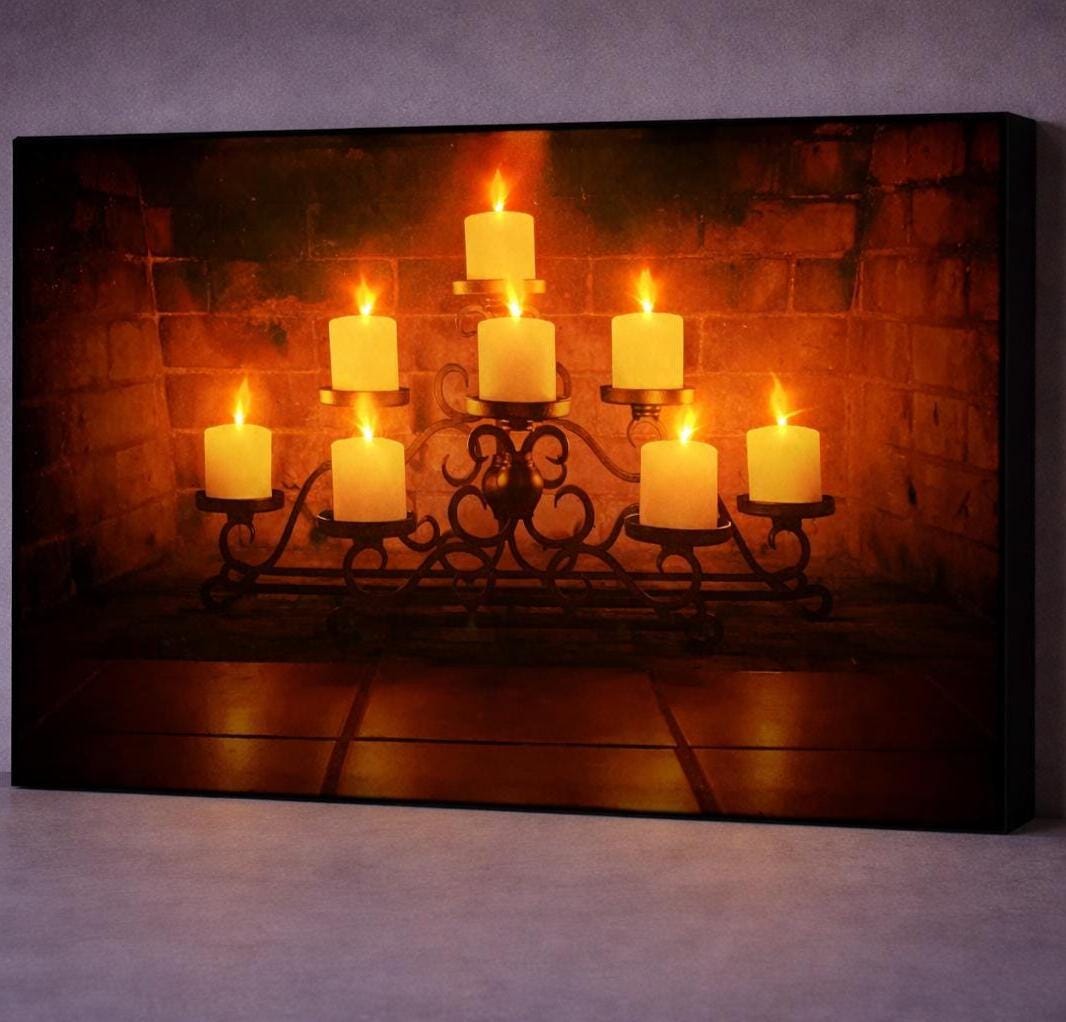 LED illuminated candle canvas wall art featuring glowing fireplace candles, ambient light wall decor, magical home artwork, cozy room lighting, decorative LED canvas art.