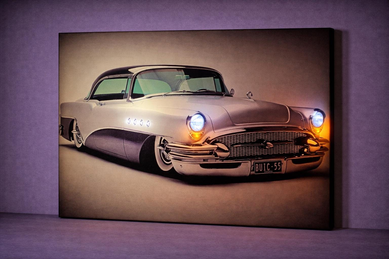 1955 classic car LED canvas wall art with illuminated headlights and vintage automotive style. Battery powered retro car decor for man cave, garage and car lover interiors.