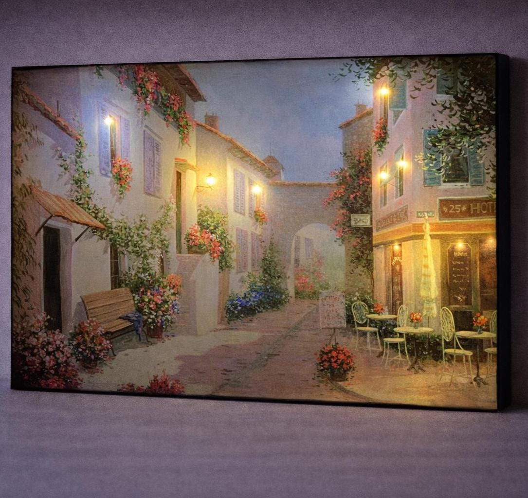 Keywords: LED canvas wall art, illuminated canvas decor, floral alleyway wall art, battery powered canvas art, European street painting, romantic wall decor, lighted wall art