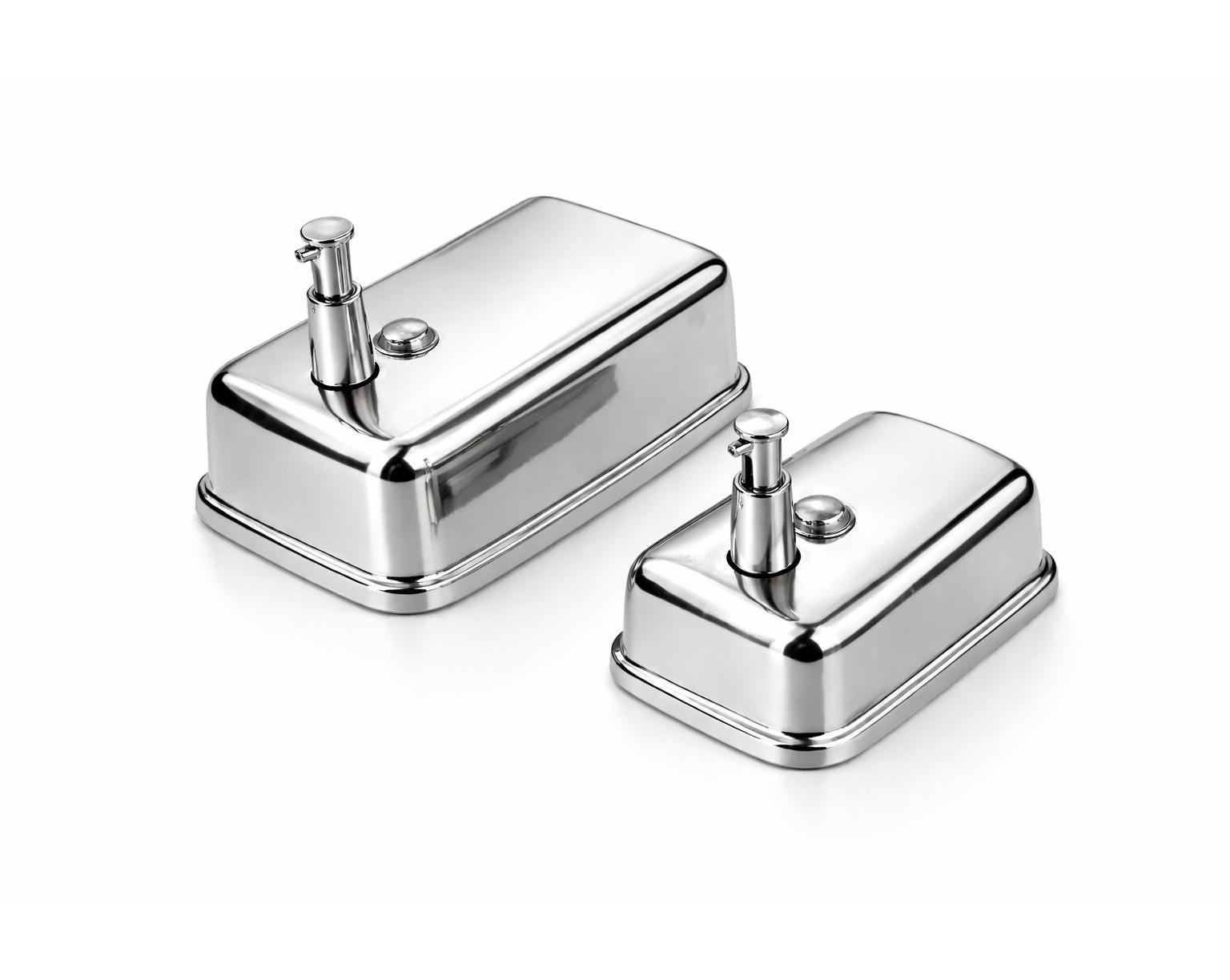 Luxury chrome polished stainless steel wall mounted soap dispenser with manual push button. Available in 500 ml and 1000 ml, rust-proof, hygienic and ideal for bathrooms, kitchens, hotels and commercial use.