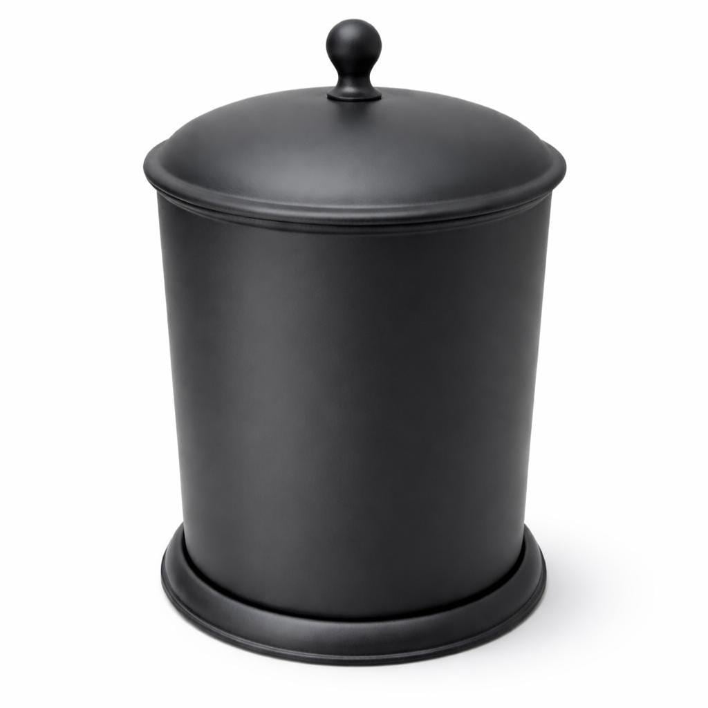 Black stainless steel waste bin with removable inner bucket and lid for bathroom and WC use. Matte black round trash can with hygienic design, easy cleaning system and durable metal body