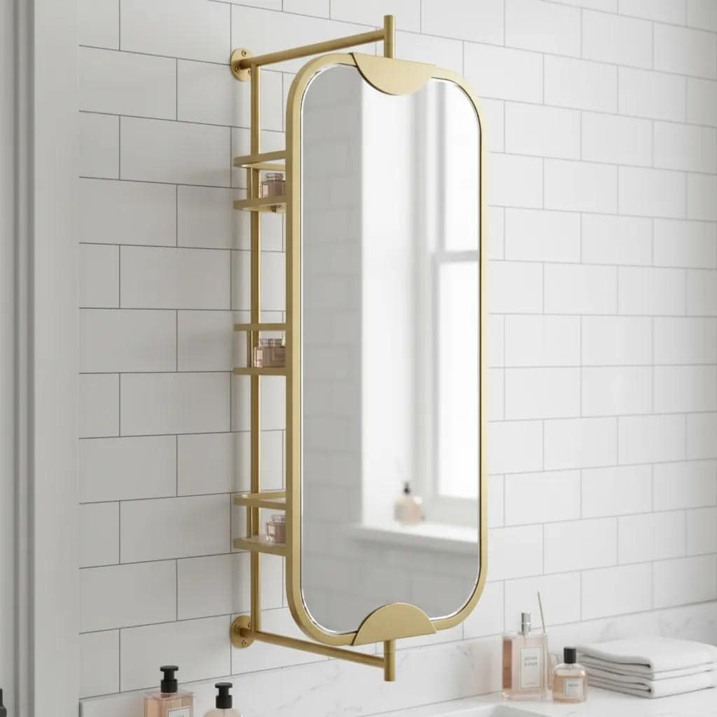 Transform your space with this innovative 360° Swivel Mirror with Shelves, designed to combine style, convenience, and premium craftsmanship. Made from high-quality brass and SS304 stainless steel, this mirror is built to last with an anti-fingerprint brushed finish that ensures a sleek, polished look at all times.